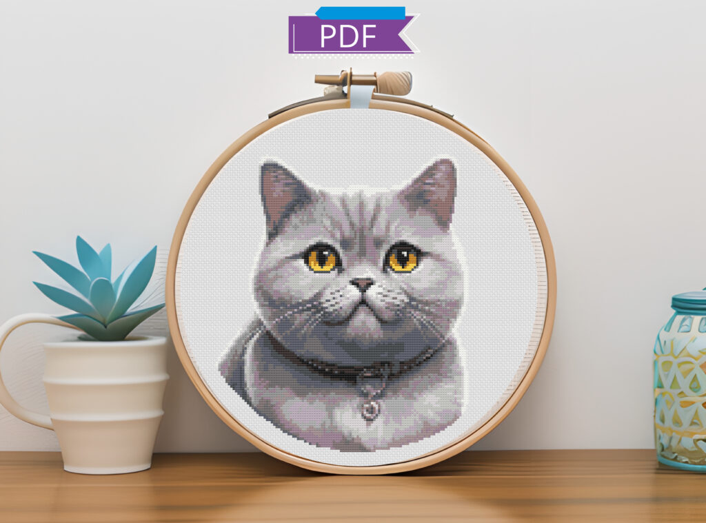 Embark on a delightful stitching journey with our charming British Shorthair cat cross stitch pattern! Known for their plush coats and captivating, round faces, these beloved felines have captured the hearts of cat enthusiasts around the globe. Now, you can immortalize their adorable features in thread form. With each stitch, you’ll bring to life the dense, cuddly fur, the iconic ‘British Blue’ hue, and those soulful eyes that twinkle with mischief and warmth.
